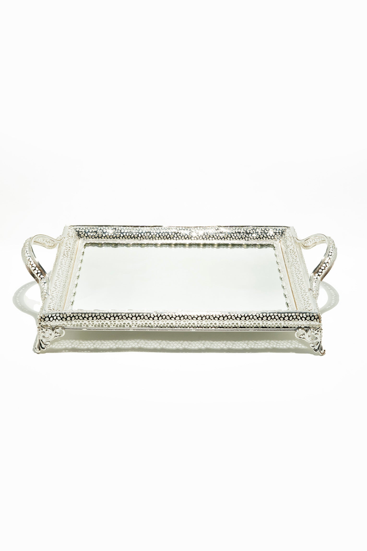 Decorative Silver Tray: Handcrafted with ornate handles and detailed patterns for a refined presentation.