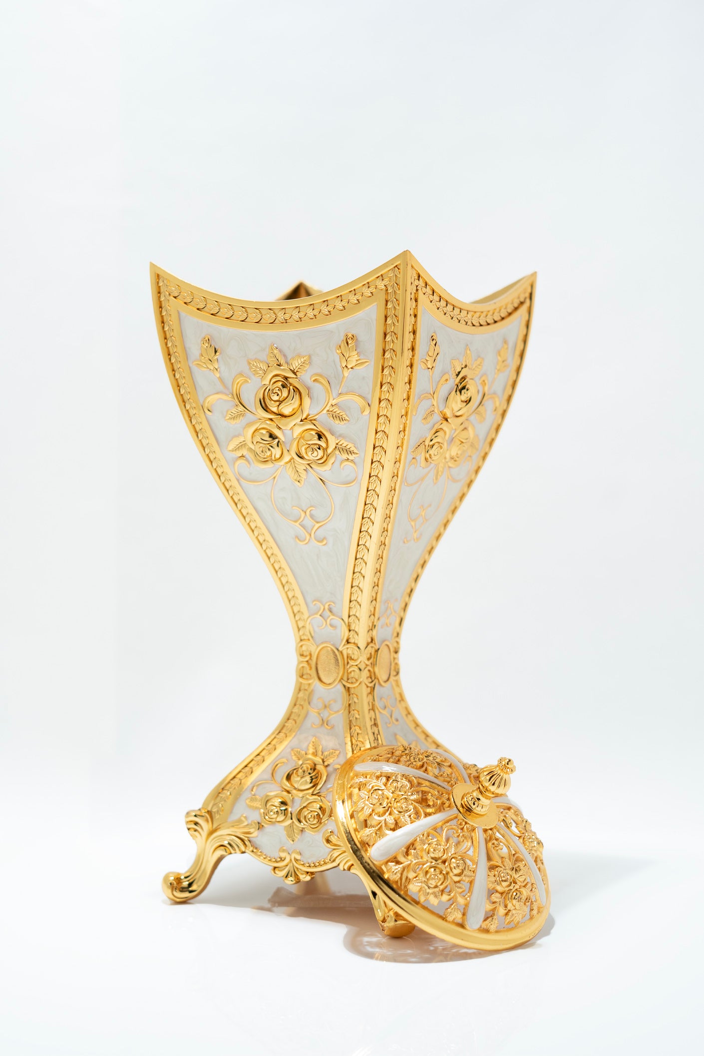 Discover timeless beauty with this gold and white incense burner set, designed with intricate floral engravings and a radiant gold finish. The white enamel backdrop enhances the elegance, making it a centerpiece of refinement, perfect for special gatherings or luxurious gifting.
