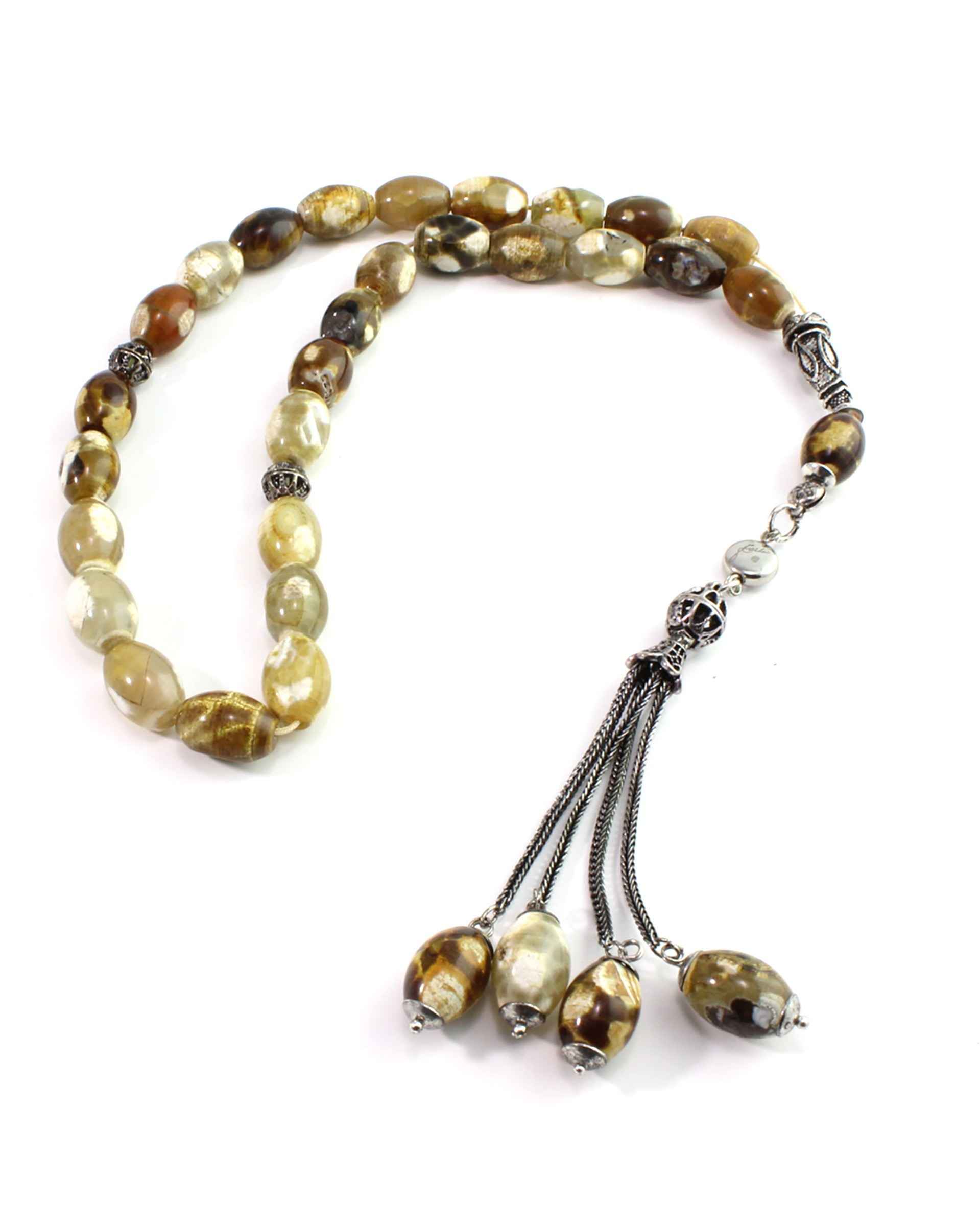 Amir Oud Misbaha Collection presents this Multicolor marbled stone beads. The sibha (Rosary) is topped with metallic and stone base ending with four metallic chain tassels each capped with marble stones.