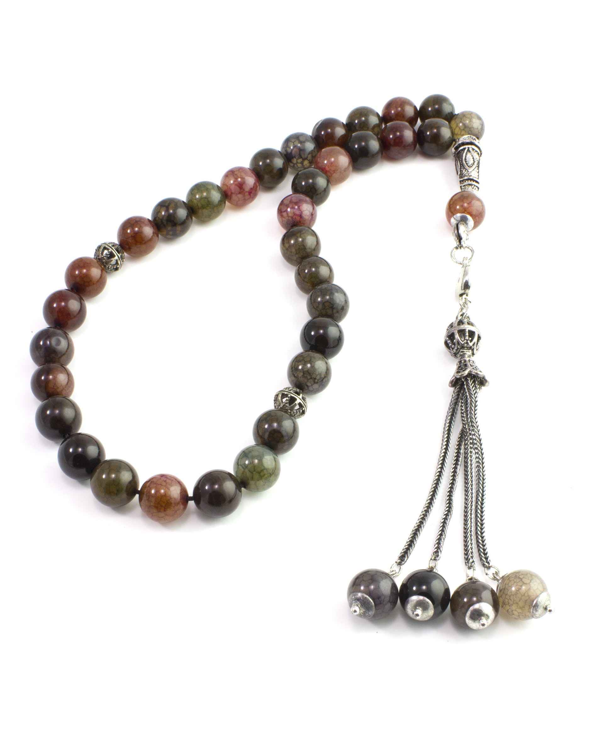 Amir Oud Misbaha Collection presents this Multicolor marbled stone beads. The sibha (Rosary) is topped with metallic and stone base ending with four metallic chain tassels each capped with marbled stones.