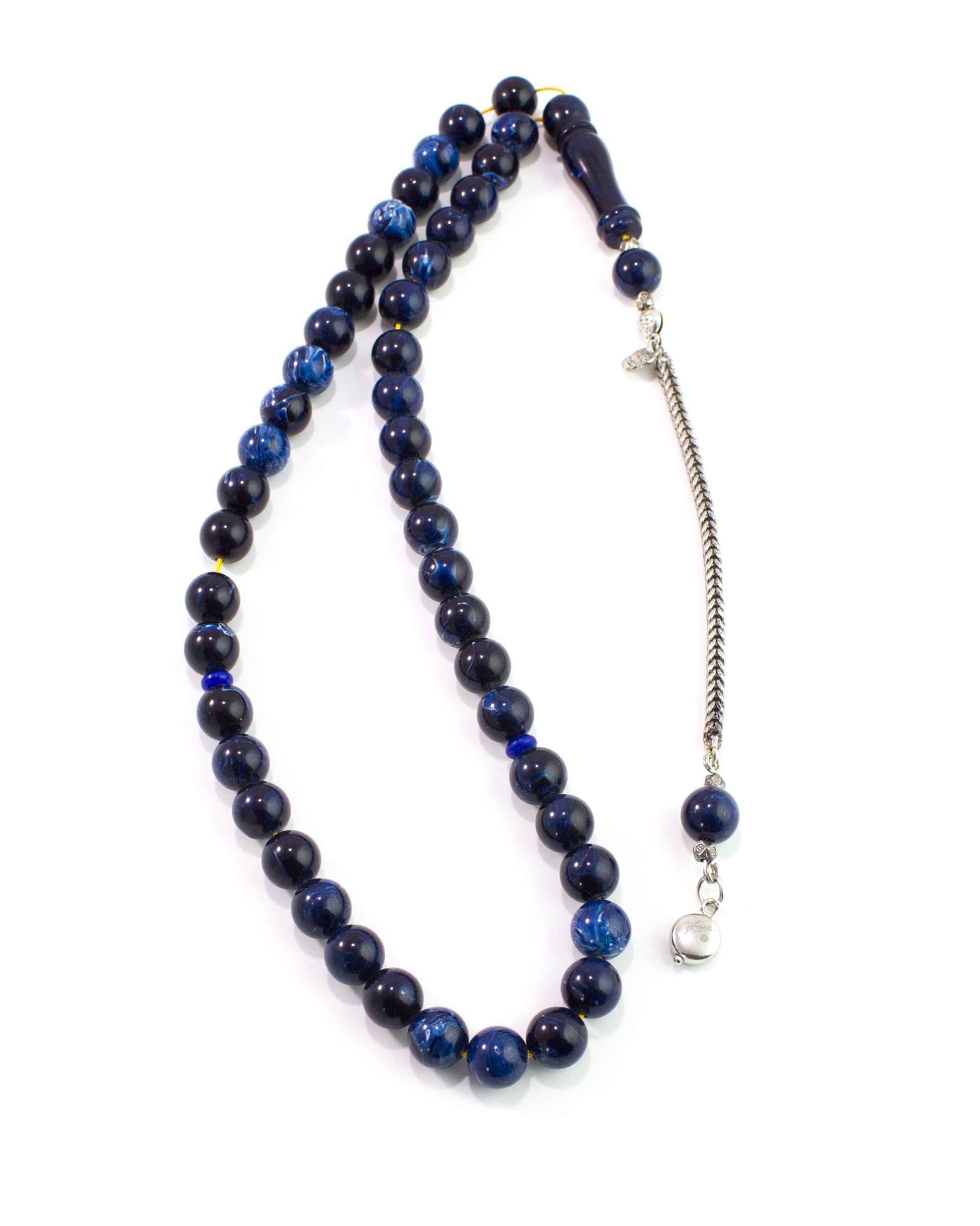 Amir Oud Misbaha Collection presents this Navy blue marble synthetic sandalose Beads. The sibha (Rosary) is topped with minaret ending with a single metallic chain tassel.
