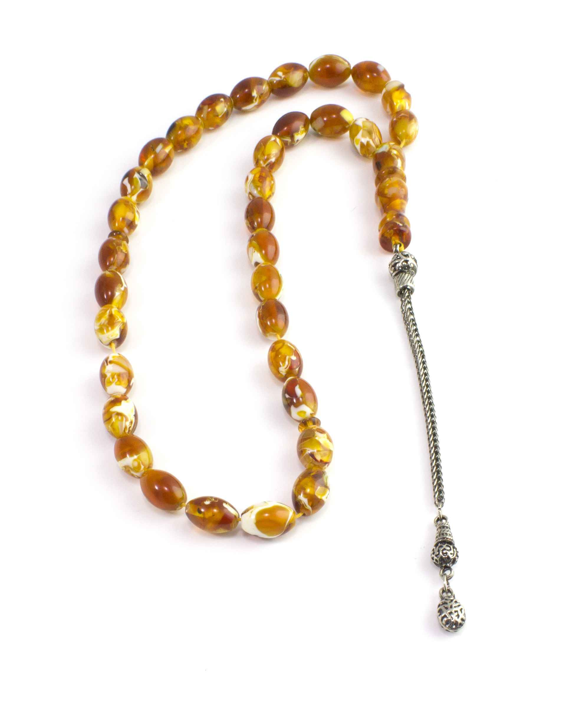 Amir Oud Misbaha Collection presents this Amber-Ivory marble synthetic sandalose Beads. The sibha (Rosary) is topped with minaret ending with a single metallic chain tassel.