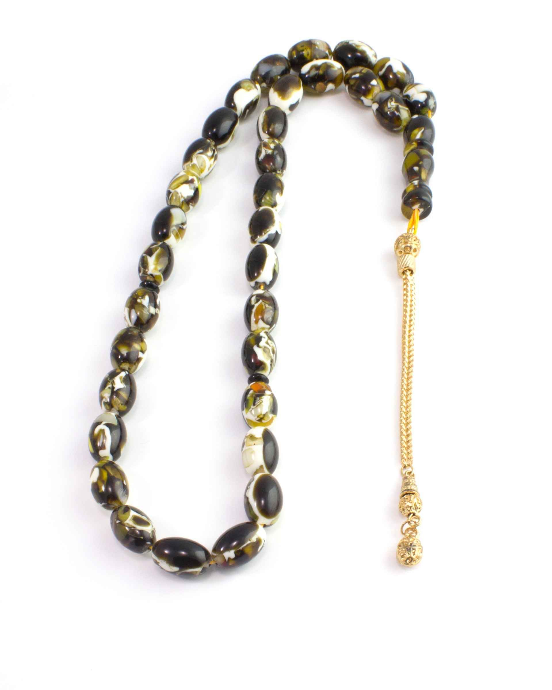 Amir Oud Misbaha Collection presents this Army Green-Ivory marble synthetic sandalose Beads. The sibha (Rosary) is topped with minaret ending with a single metallic golden color chain tassel.