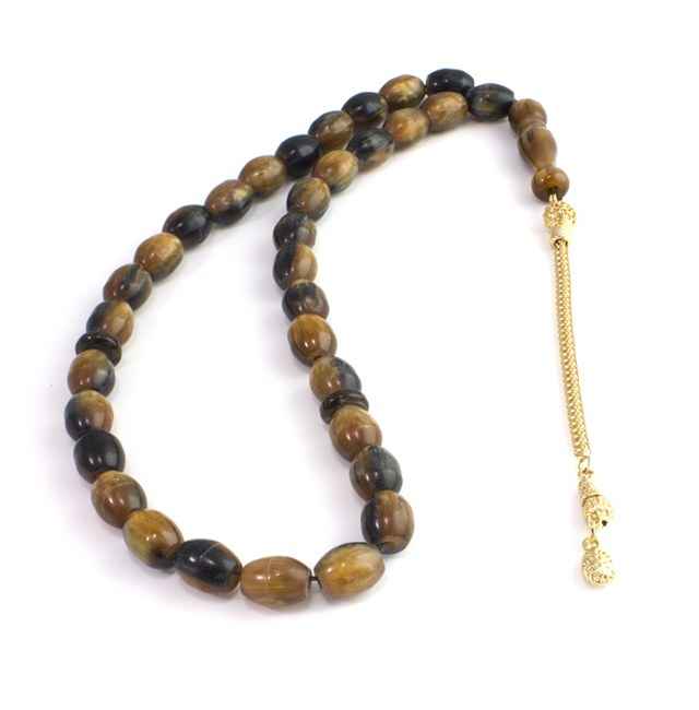 Amir Oud Misbaha Collection presents this Dark Brown marble synthetic sandalose Beads. The sibha (Rosary) is topped with minaret ending with a single metallic golden color chain tassel.