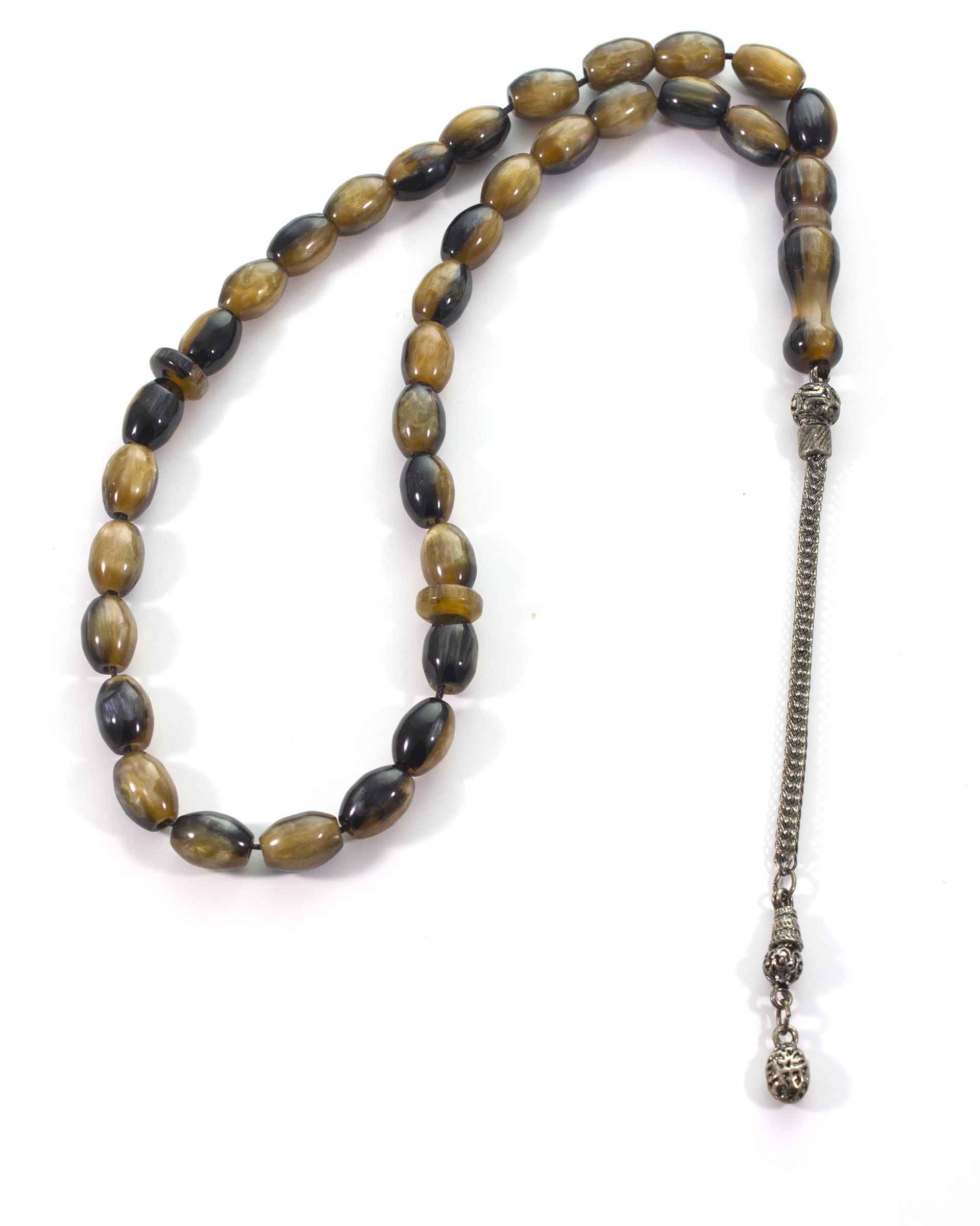 Amir Oud Misbaha Collection presents this Dark Brown marble synthetic sandalose Beads. The sibha (Rosary) is topped with minaret ending with a single metallic chain tassel.