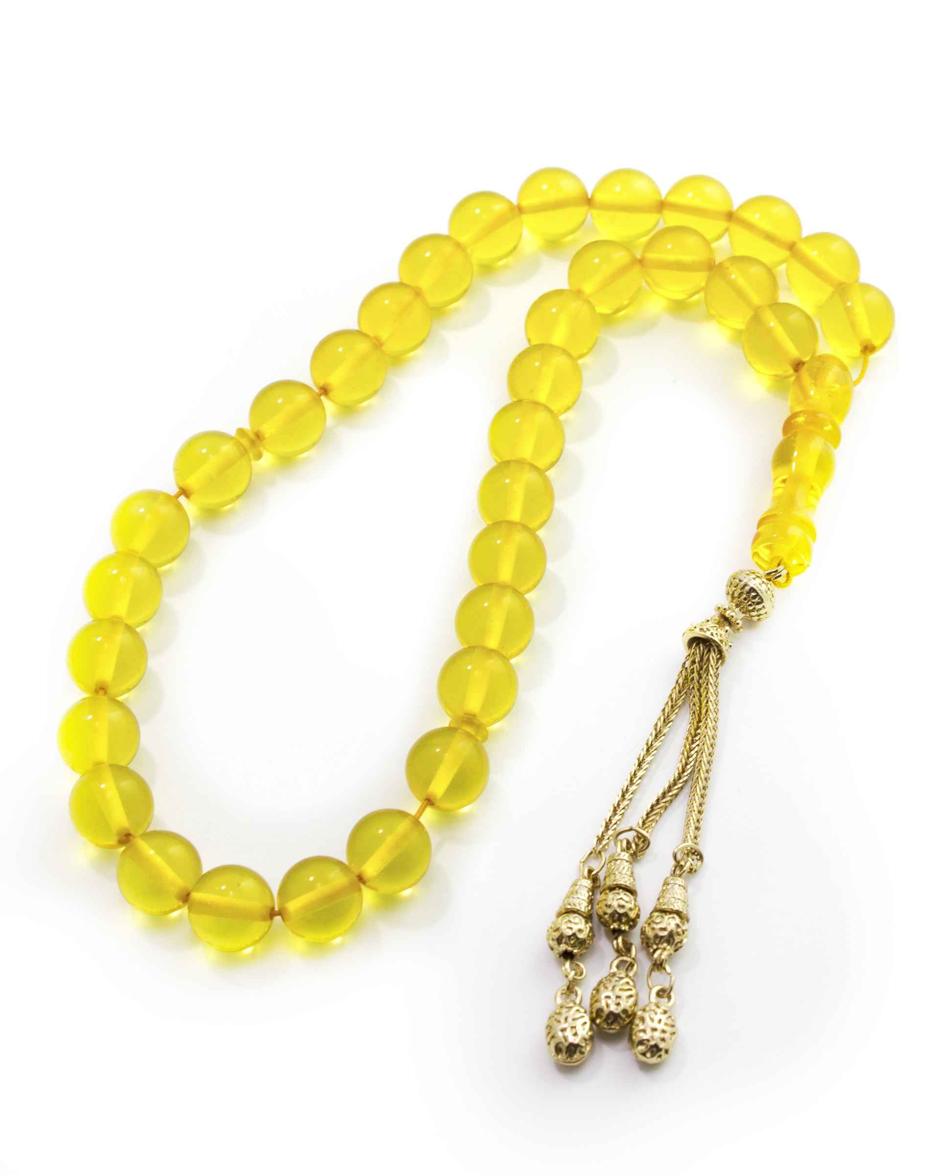 Amir Oud Misbaha Collection presents this Yellow clear Synthetic sandalose Beads. The sibha (Rosary) is topped with minaret ending with Trible metallic golden color chain tassel.