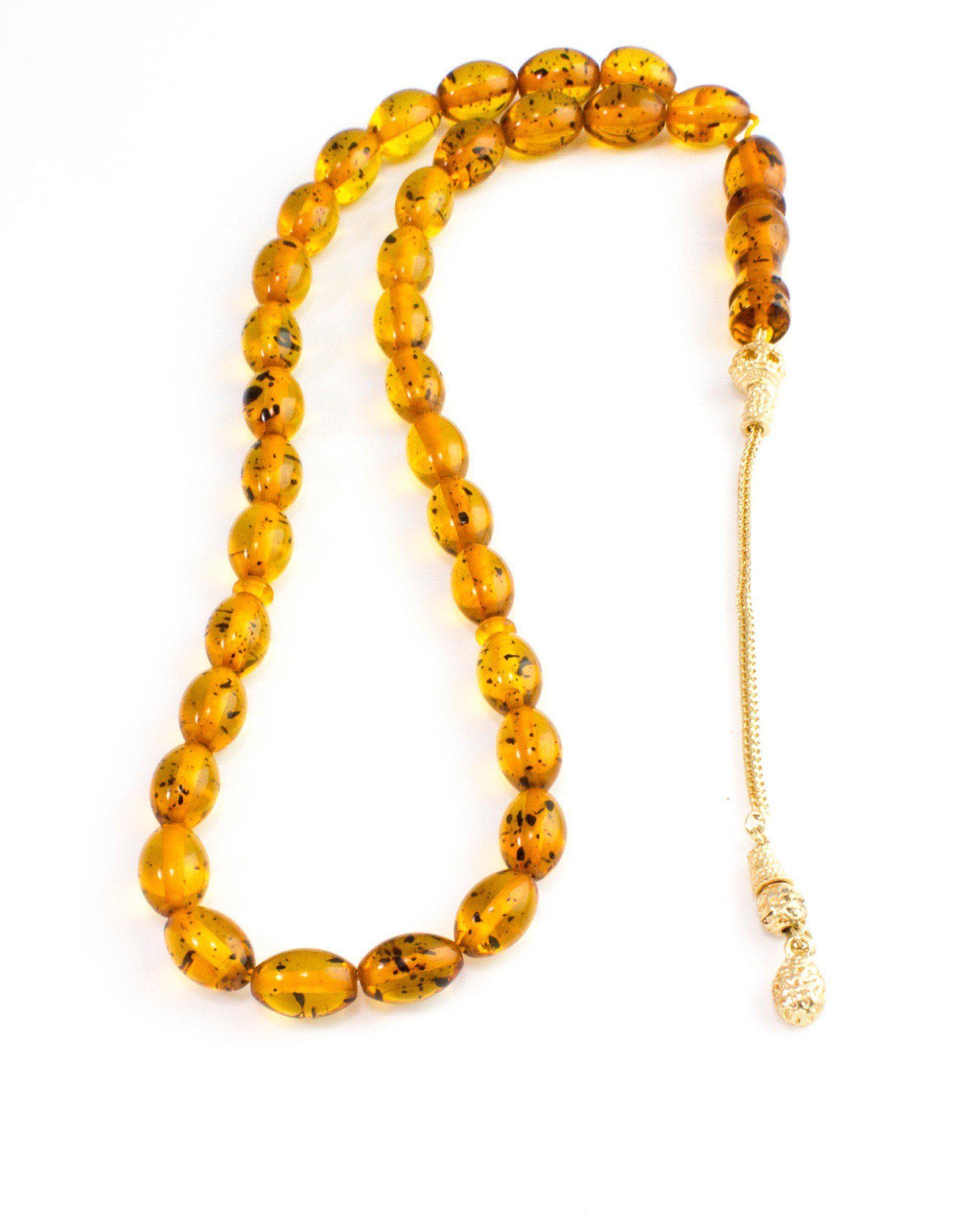 Amir Oud Misbaha Collection presents this Clear Amber doted synthetic sandalose Beads. The sibha (Rosary) is topped with minaret ending with single metallic golden color chain tassel.